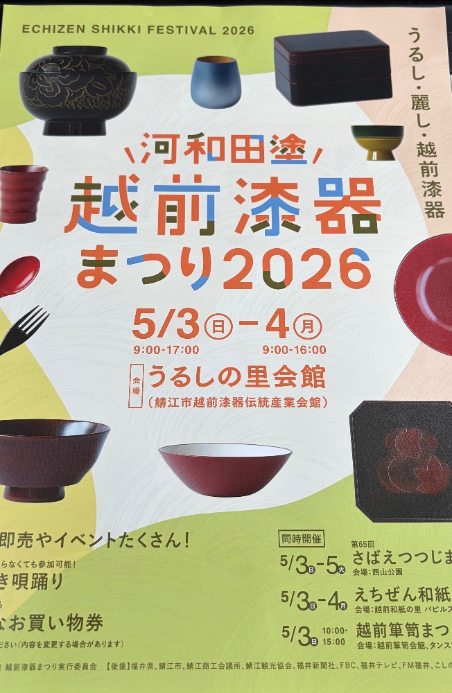 うるし工房 錦壽(KINJU)越前漆器祭り、5/3〜4日出店、今年の予定11月〜12月、二子玉川、コホロ、在廊予定12月〜1月、、無印良品銀座店4F、在廊予定